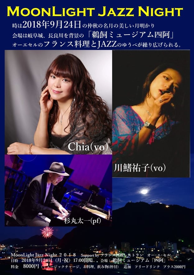 時は、2018年9月24日(中秋の名月)の美しい月明かり 会場は 岐阜城、長良川を背景にした「鵜飼ミュージアム四阿(あずまや)」 メンバーは、岐阜の誇るボーカリスト二人「Chia」と「川鰭祐子」 ピアノに「杉丸太一」がおくる 豪快なメンバーによるスペシャルなムーンライトジャズナイト♪ お料理は、オーエセルのシェフがフレンチのコース料理をつめこんだ...